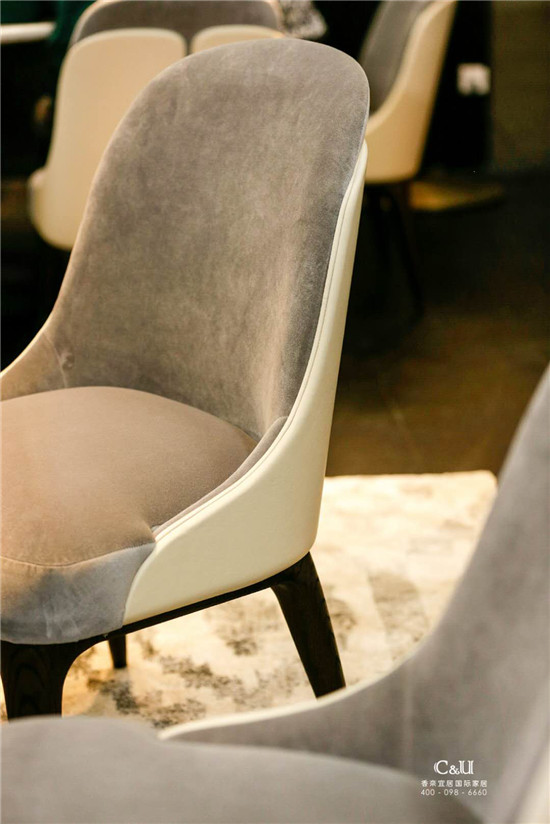 以两色调作设计,配以菱形天鹅绒、皮革坐椅、木质底和铜脚。