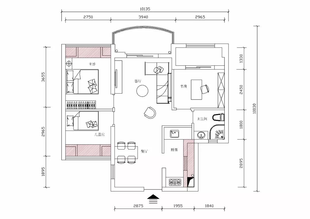红色区域为赠送面积,可拆除扩建出去。虽然房子居于楼层中间,但借由通风井,除了面宽优势,采光佳之外,整个住宅通风效果也很好。(来源:家装室内设计)
