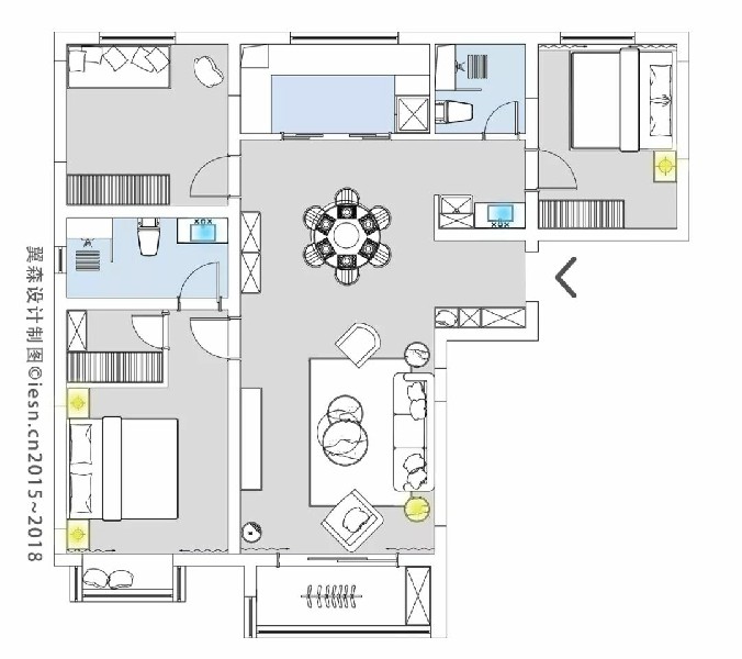 平面布置图:这是一套129平米的现代美式风格装修案例,整体空间以浅蓝色的墙空间基础,带来一种浪漫情趣的空间氛围,并在空间内布置上轻奢华丽的软装家具,呈现出一个轻松与浪漫雅致的空间氛围。(来源:设计馆)