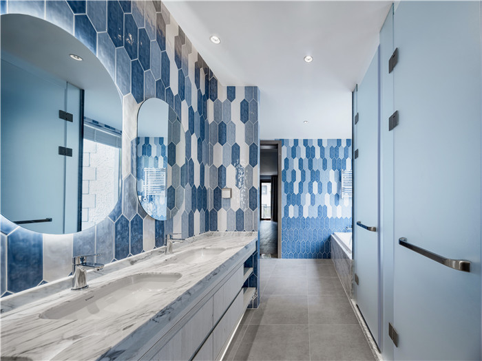 儿童卫生间用色鲜明,精致的线条搭配极具奢华感的石材,设计与空间的结合,就像多年好友偶遇,契合点不断迸发碰撞,最后落地成景成境。功能与美观,材料与肌理,生活与艺术,都能在老洋房改造里找到纾解之道。