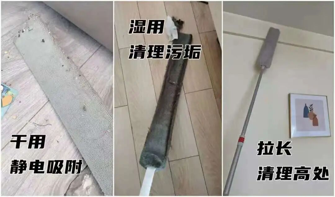 跟鸡毛掸子类似,但它的刷头是可以180°任意弯曲的,伸缩杆是加长的,可以轻松打扫空调、柜子、灯具等处。