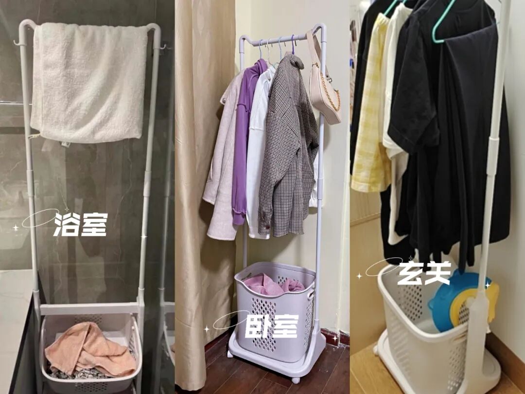 放在浴室,上面挂浴巾及要换的干净衣物,下面当脏衣篮用,解决了浴室洗澡衣物的收纳问题,放在玄关,充当挂衣区。