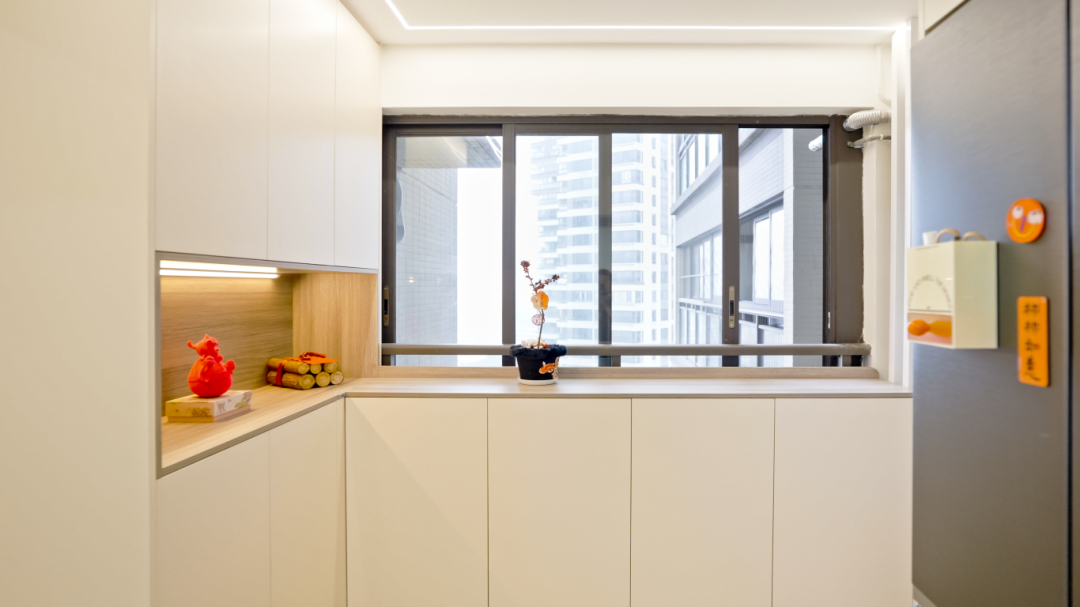 沙发背后定制原木色与白色组合柜,开放格设计用于展示手办、绿植等,延伸至餐厅成为餐边柜,融入水吧、咖啡角与嵌入式电器,满足多元需求。